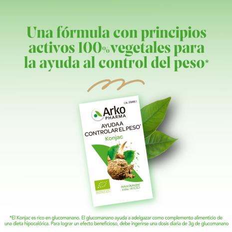 Arkocápsulas® Konjac BIO es un complemento alimenticio a base de Konjac, rico en Glucomanano, que ayuda a adelgazar como complemento alimenticio de una dieta hipocalórica.